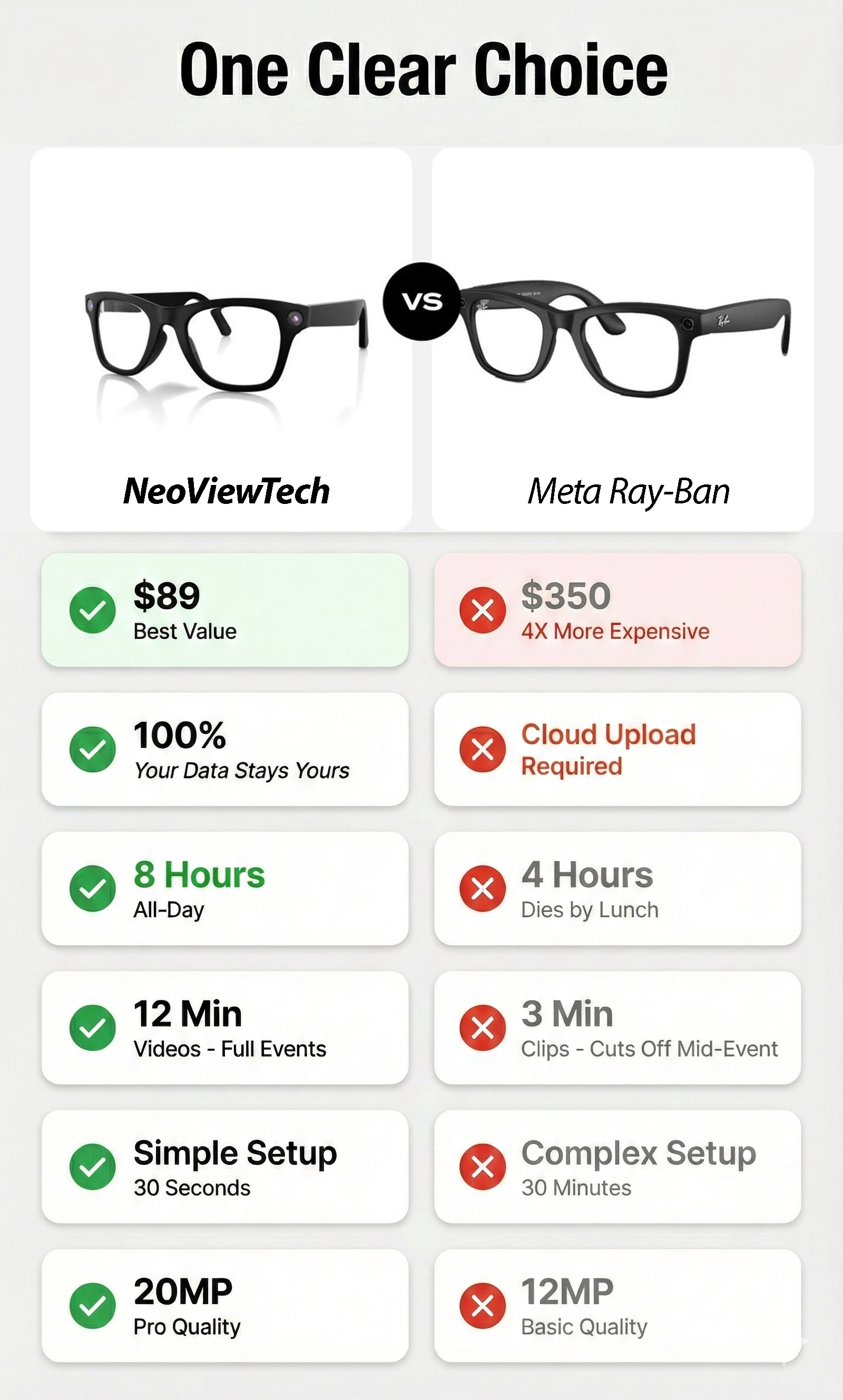 ✓ 9-min videos vs 3-min limit (Meta Ray-Ban)