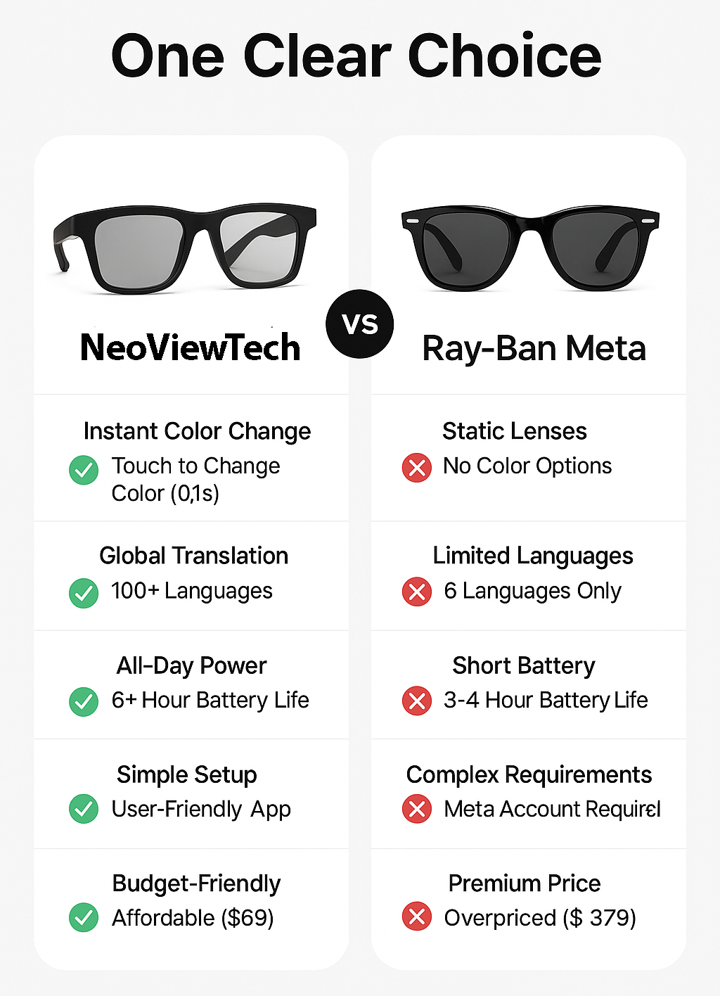 "Does everything the $400 glasses do - translation, color change, all-day battery. Saved $330 and got better features. Why pay more?"